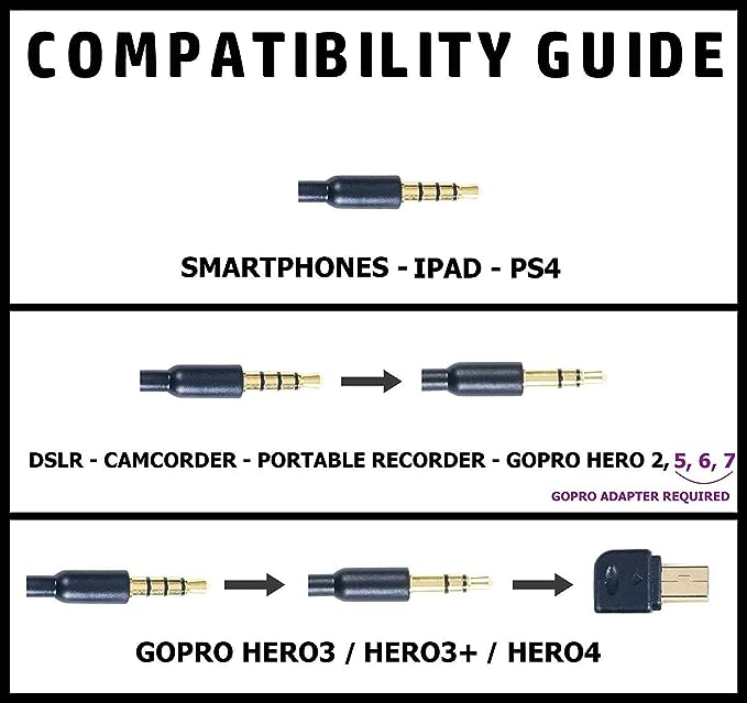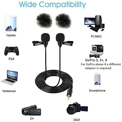 PLUG&PLAY: No need for batteries, app downloads, or configurations! Just Plug the dual lavalier mic into MIC jack of Your Device and you are ready to go! Use the 3 adapters included (micro usb, TRS, TRRS) for any smartphones, computers/mac, recoroding device, DSLR cameras, tablets, PS4, GoPro 3,3+,4 or video cameras. *Note1:For newer iphone that have lighting only a lighting adapter is required and then just plug it in the Y type adapter(included)*Note 2: For GoPro Hero 5, 6, 7 mic adapter is required