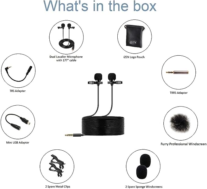 WHAT'S IN THE BOX: Dual Lavalier Microphone comes with one audio cable with two 2 lavalier microphones, 2 foam windscreens and 2 metal clips, iZEN Logo vegan leather pouch for easy transportation, 1 TRS adapter, 1 TRRS adapter, 1 Micro USB adapter, 2 spare foam windscreens, 2 spare metal lapel, 2 Professional Furry Windbreaks